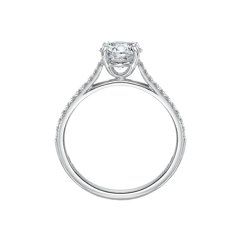 Precision Set's New Aire Semi Mount Ring has a shank crafted from 18k white gold with round brilliant diamonds set half way around. The four prong head is made of platinum and waiting for your unique center stone as the finishing touch.