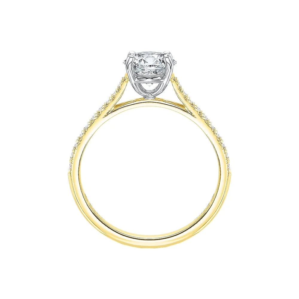 Precision Set's New Aire Semi Mount Ring has a shank crafted from 18k yellow gold with round brilliant diamonds set half way around. The four prong head is made of platinum and waiting for your unique center stone as the finishing touch.