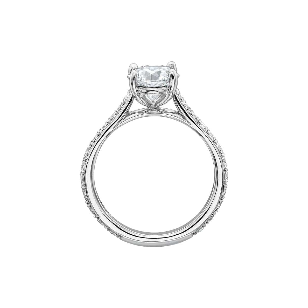 Precision Set's New Aire Semi Mount Ring has a shank crafted from 18k white gold with round brilliant diamonds set three-quarters around. The four prong head is made of platinum and waiting for your unique center stone as the finishing touch.