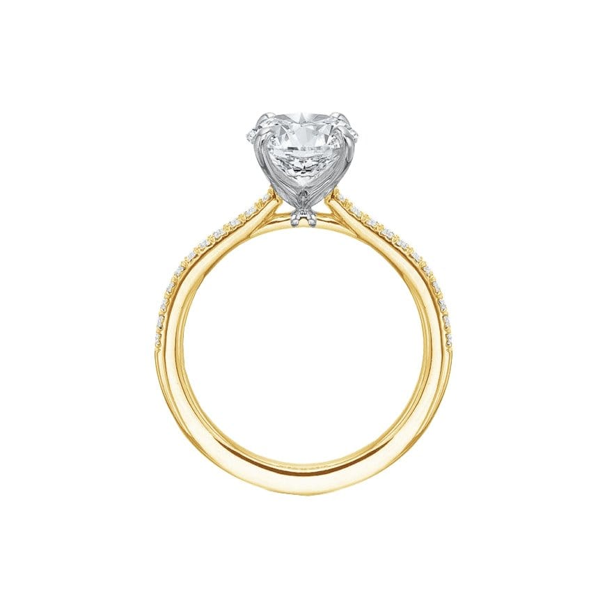 Precision Set's New Aire Low Profile Semi Mount Ring has a shank crafted from 14k yellow gold with round brilliant diamonds set half way around. The four prong head is made of platinum and waiting for your unique center stone as the finishing touch.