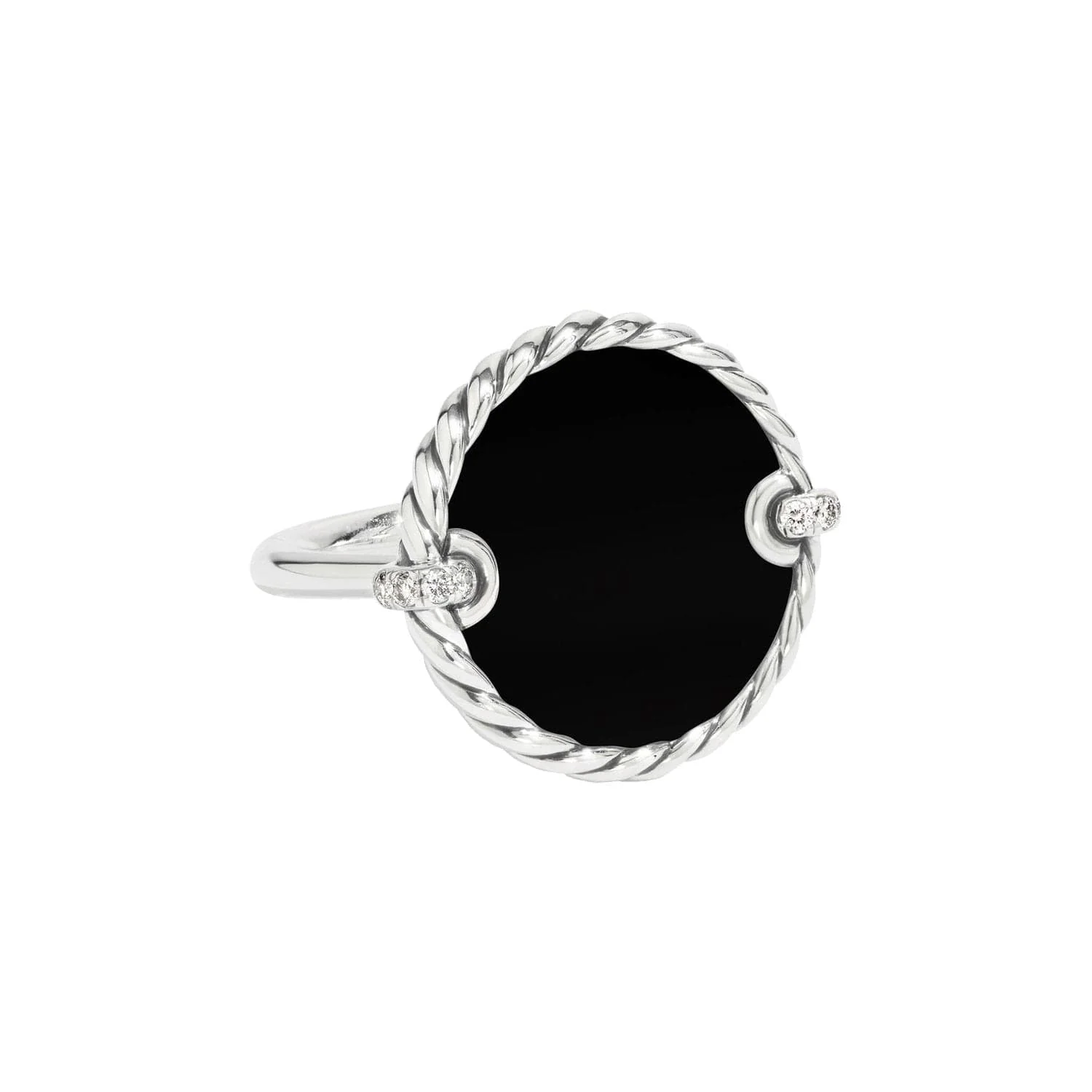 In this collection, David Yurman explores the circle - a timeless symbol of unity; a shape without beginning or end. Crafted from sterling silver, this DY Elements ring features an 18mm black onyx inlay accented with round brilliant diamonds.